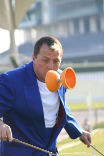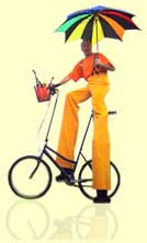 I juggle with Balls, Glow Balls, Clubs, Glow Clubs, Knives, Machetes, Fire, Rubber Eggs and Chickens, perform with Devil sticks, Cigar Boxes and Diabolos. I ride Unicycles, Micro Mini Bike, Penny Farthing and the amazing 6-foot Stilt Bicycle plus The Lunibike (a curious French circus trick bike) and the Unicycle Plus (the plus being a front wheel and handlebars, entirely independent to the unicycle!).